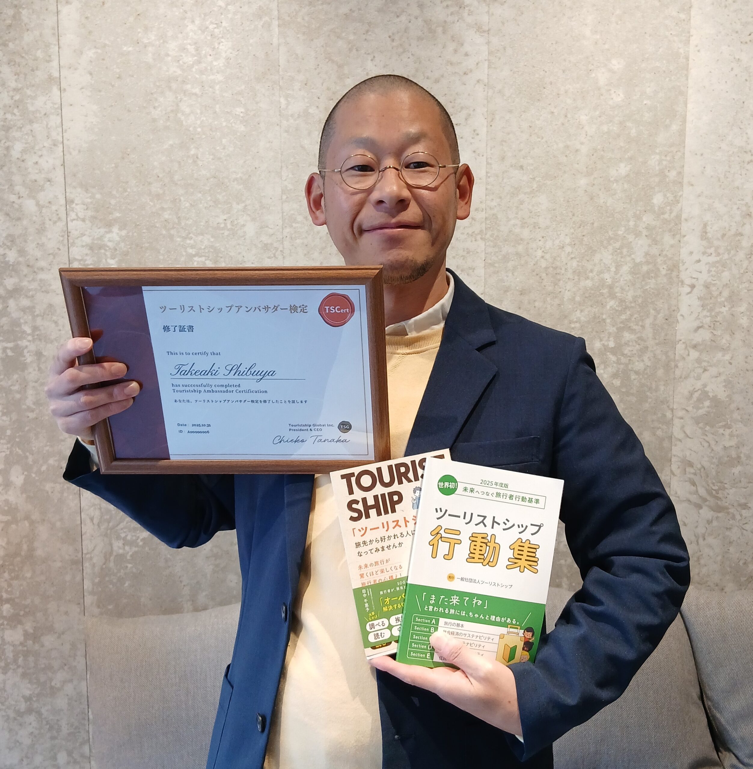 2025年10月31日 JARTA国際認証部長の渋谷が、ツーリストシップアンバサダー検定を修了しました。 今後はアンバサダーとして、日本におけるサステナブルツーリズムの実現に向けた普及・啓発活動に引き続き取り組んでいきます。 ツーリストシップ検定の詳細はこちら https://tscert.com/ ツーリストシップについてはこちら https://touristship.jp/